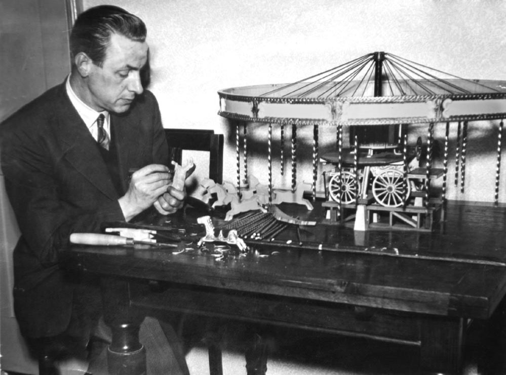 A E Dandridge at work making part of the model fairground rideClose up of the horses, each one slightly different